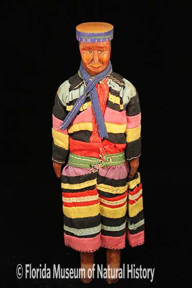 Dating before 1918, Seminole and Miccosukee men carved dolls out of wood and clothed them in traditional Seminole and Miccosukee outfits to sell to tourists. It was taboo, however, to carve realistic dolls that resembled a specific person. The Seminole and Miccosukee believed that a realistic doll would bring harm to the person it looked like, as well as to the person who made it. The palmetto fiber dolls that you see today are not exact images of Seminole and Miccosukee people, but altered impressions of features important to the tribes, such as hairstyle and clothing.