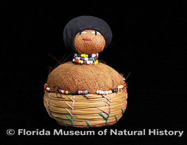 Basket Head Dolls and Pin Cushion Dolls (Figures 20 and 21) Doll-head baskets are made of sweet grass or pine needles (Figure 20). Most baskets that the Seminole and Miccosukee made were intended for everyday use. However, the Seminole and Miccosukee started to make beautiful baskets for the tourist market. Deaconess Harriet Bedell is credited for the idea to have the doll heads on the baskets lids. Some of these baskets had palmetto doll heads attached to the lid to create an item unique to the Seminole/Miccosukee. They also created doll pincushions and these are highly decorated with beads.