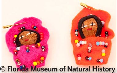 These small female dolls are made to be pinned to clothing (Figure 11) or to larger dolls as a way to represent children (Figure 12). It is not known when these dolls were first made, but the earliest recorded pin doll is from 1941. Sometime after the 1970s, pin dolls were created in a papoose (Figure 13). This is unusual because the Seminole and Miccosukee did not place their children in such carriers. Male pin dolls are very rare.