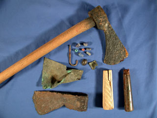 By the middle of the seventeenth century, the mission effort was actively underway in the Eastern Timucua, Guale, Western Timucua and Apalache Indian provinces. Indians from all of these areas frequently came to St. Augustine as part of transport convoys, and also as part of labor drafts to work in the town. Although Indians from the mission provinces had little choice about serving in the labor drafts, they were “paid” wages in goods, or less commonly, money. Typical items of payment included hawksbells, knives with black or white hafts, blue beads, multicolored beads, sheet brass, red cloth, razors, scissors and hatchets.