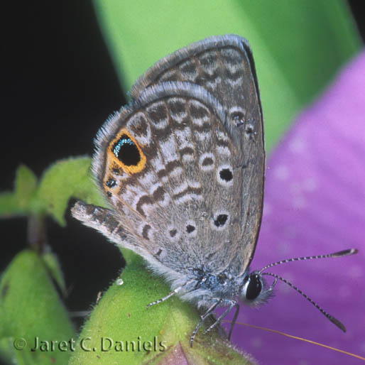 - General description: male violet blue with white fringes and small black spot along outer hindwing margin. Female brown with blue scaling limited to wing bases and small black spot along outer hindwing margin. Ventral hindwing gray with darker bands, two black spots along leading margin, a narrow (often faint) white postmedian band, and a single orange-rimmed black eyespot along outer margin.