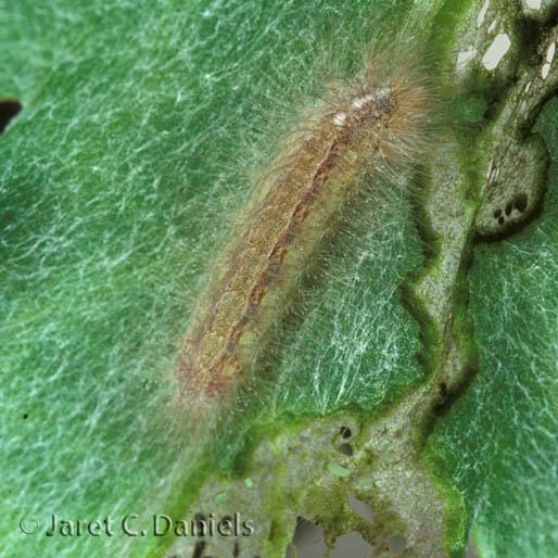 - Life Cycle: Egg: laid singly on host leaves Mature larva: light green with long plumelike white hairs Chrysalis: green and cream with darker markings