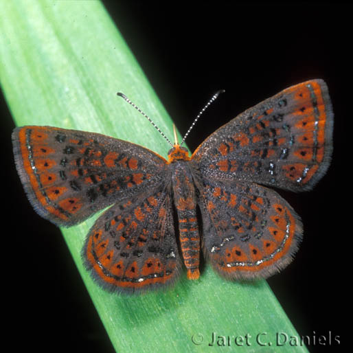 - Additional Information: adults flutter very low to the ground; perches with wings open and periodically lands on the undersurface of leaves; colonies often local