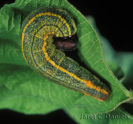 - Life Cycle: Egg: Light yellow, laid singly or in short stacks on host leaves Mature larva: Yellow-green with black speckling, a black dorsal line, and a yellow lateral band that becomes orange toward the rear. Head black with reddish-brown patches on lower margin. Chrysalis: Brown with white waxy covering.