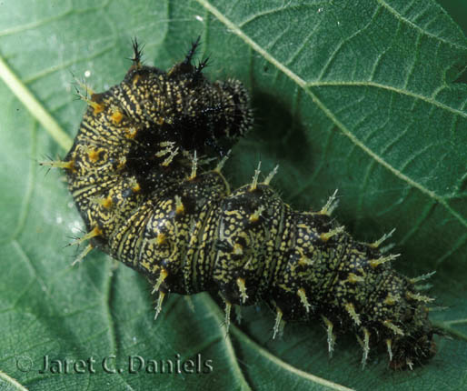 - Life Cycle: Egg: Small, green, laid singly on host leaves Mature larva: Black with fine white mottling, a lateral band of white spots, and numerous black branched spines Chrysalis: Gray-brown